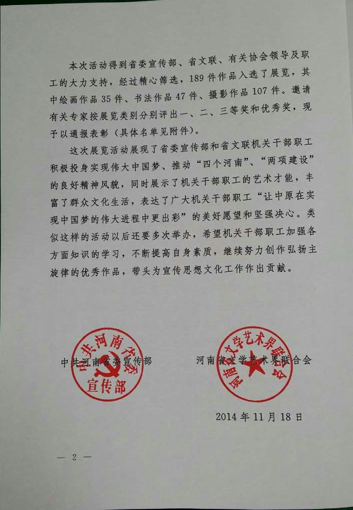 關(guān)于慶祝建國65周年 及文明河南建設(shè)書畫攝影展的表彰通報